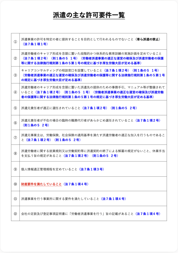 また、動画の中で出てくる「派遣の主な許可要件一覧」は動画下に掲載していますので、よろしければダウンロードしてお使いください。